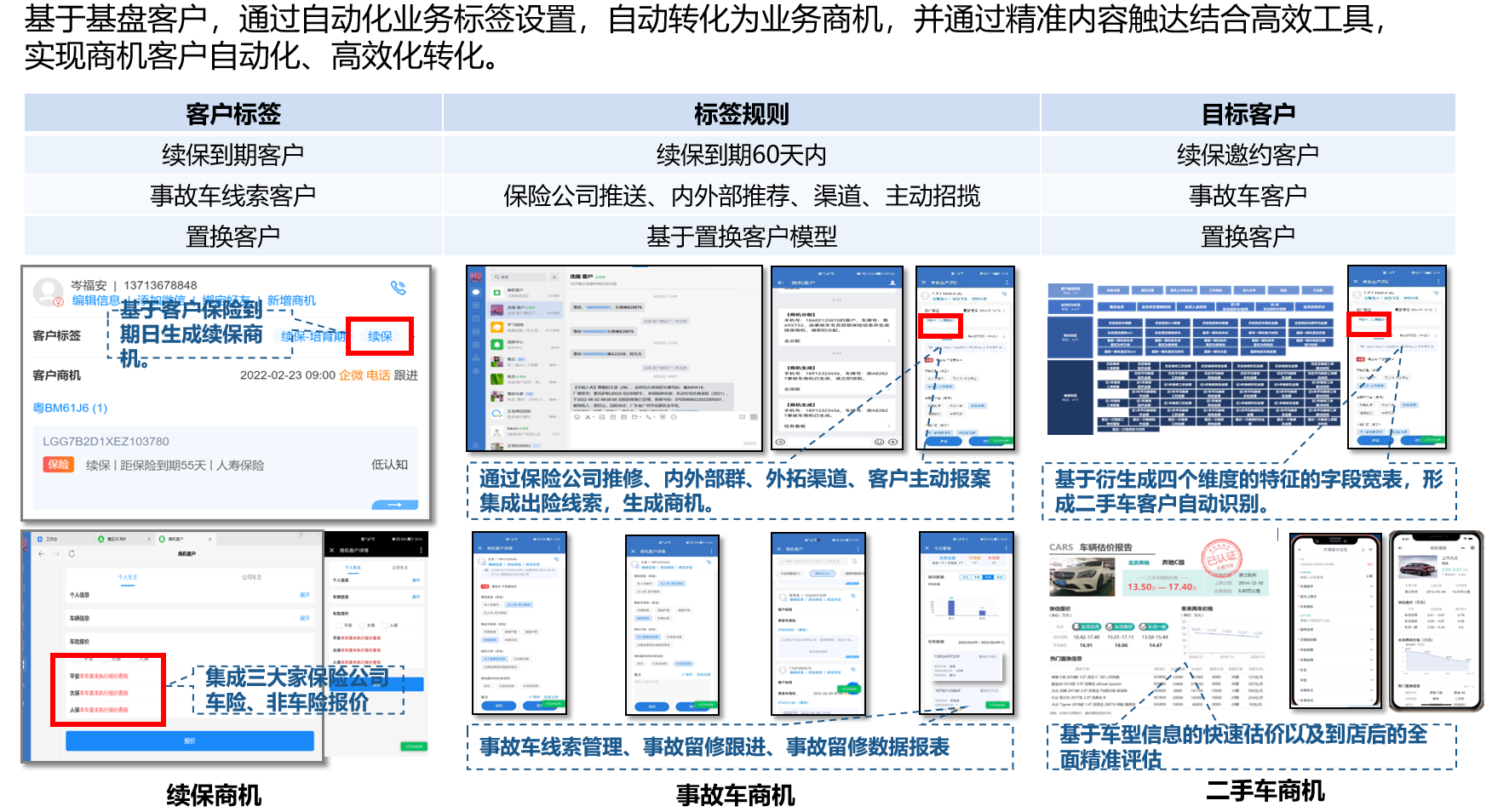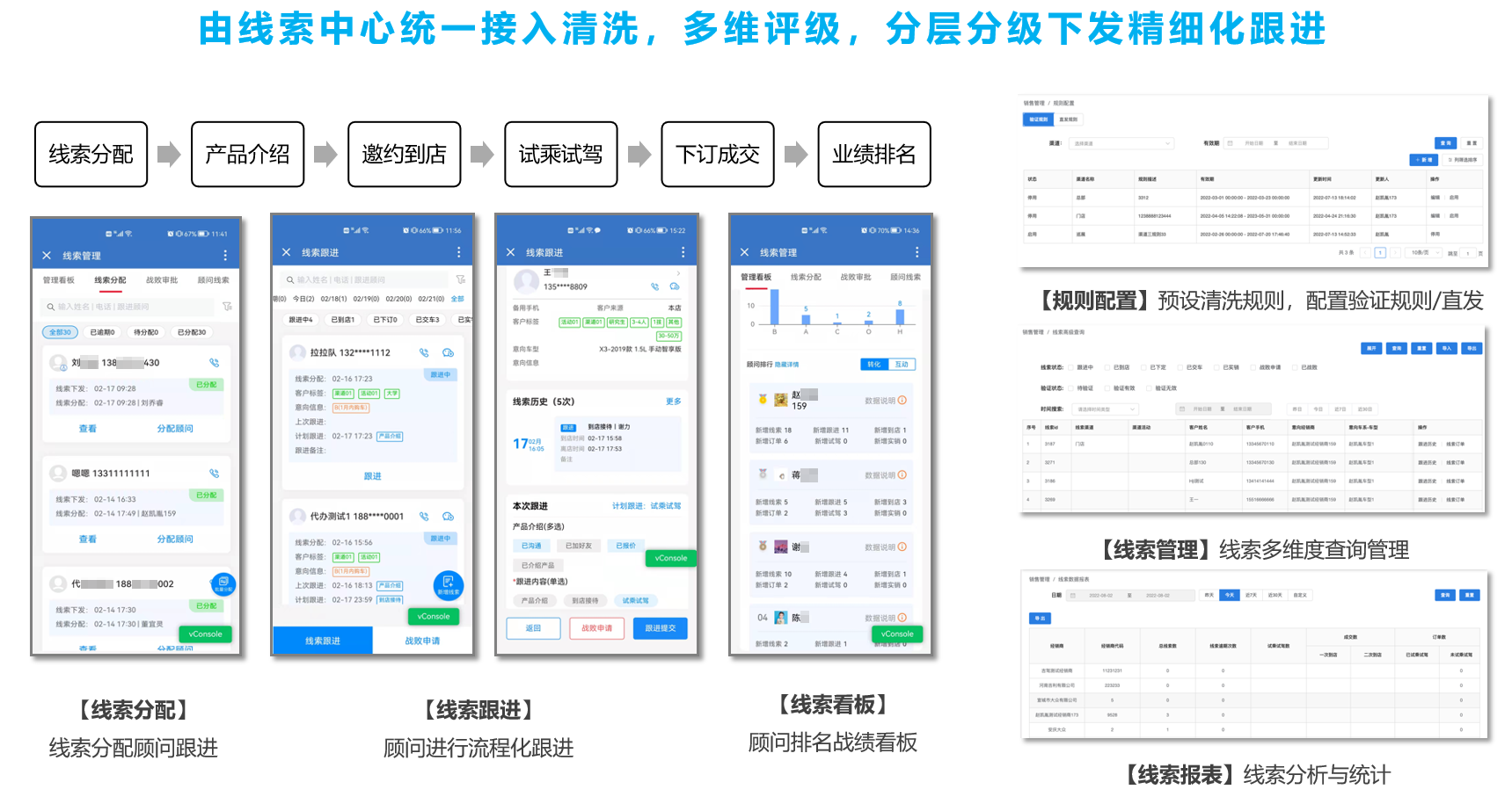 由线索中心统一接入清洗,多维评级,分层分级下发,精细化跟进销售过程。同时挖掘售后商机,基于基盘客户,通过自动化业务标签设置,结合高效工具,做到精准内容触达,实现商机客户自动化、高效化转化。