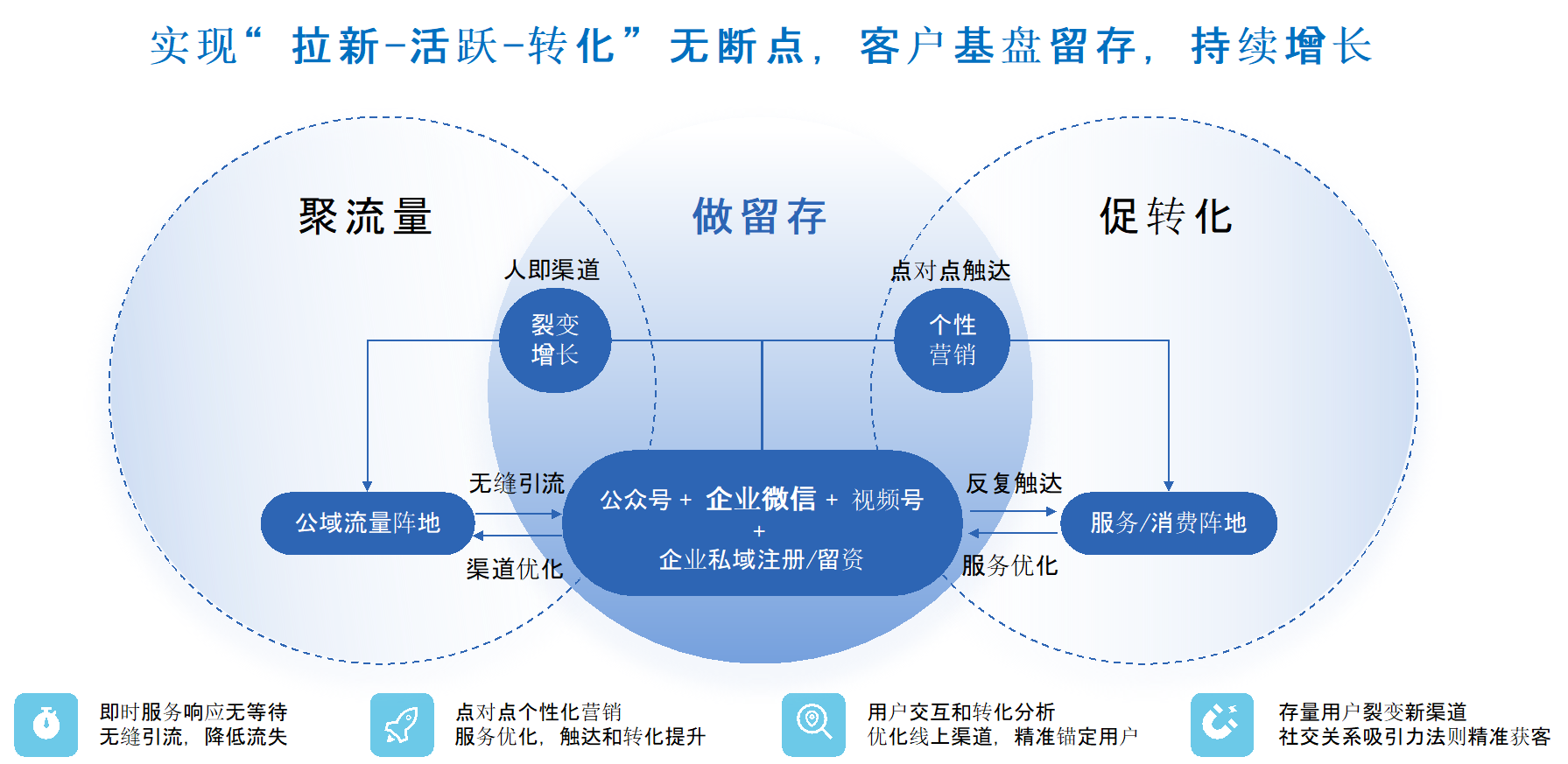 通过企微工具,无缝引流、降低流失。通过点对点个性化营销,强化用户交互与转化分析,实现“拉新-活跃-转化”无断点,保障留存客户基盘,促进持续增长。