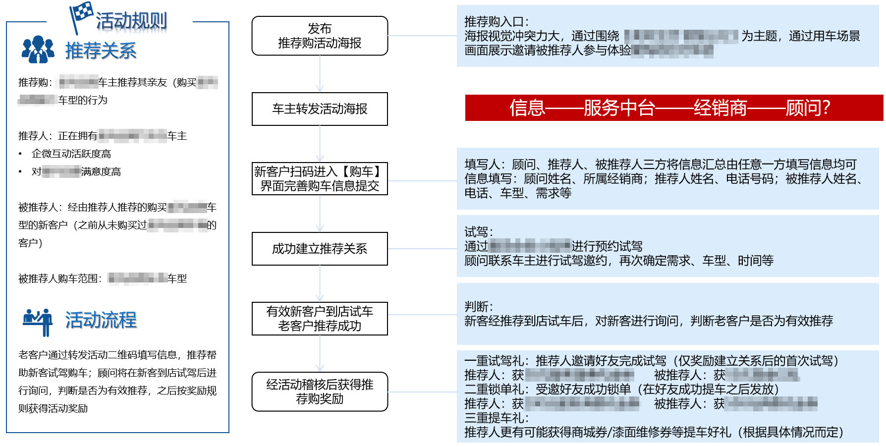 设计奖励体系(试驾礼、锁单礼、提车礼),激励车主推荐亲友购车,结合企微社群传播扩大圈层影响力。同步搭建积分商城、任务体系,提升会员活跃度与复购率,挖掘用户全生命周期价值。