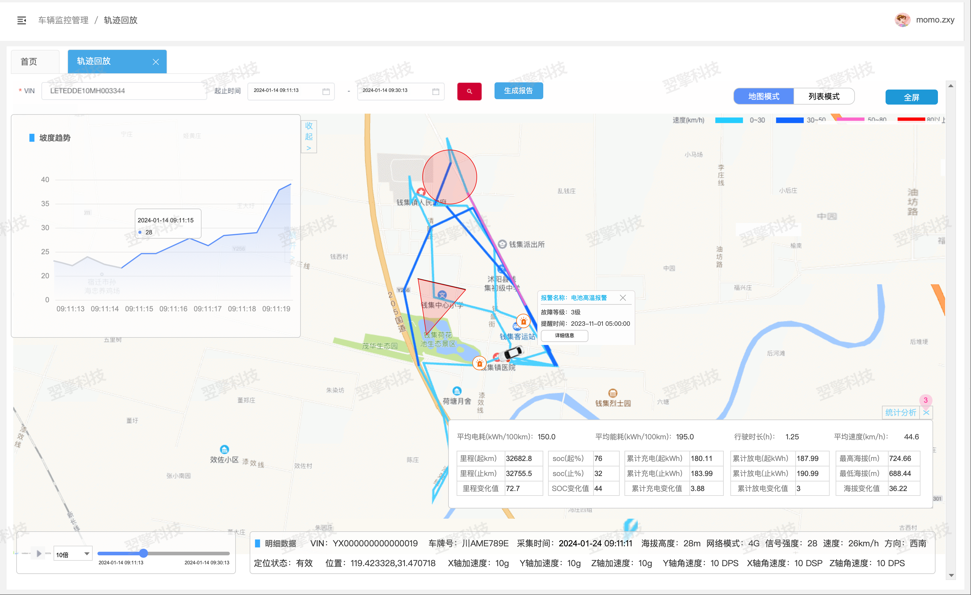 支持研发分析人员针对车辆运行时间段内实时回放数据以及轨迹、海拔、里程、SOC、充放电等统计分析。