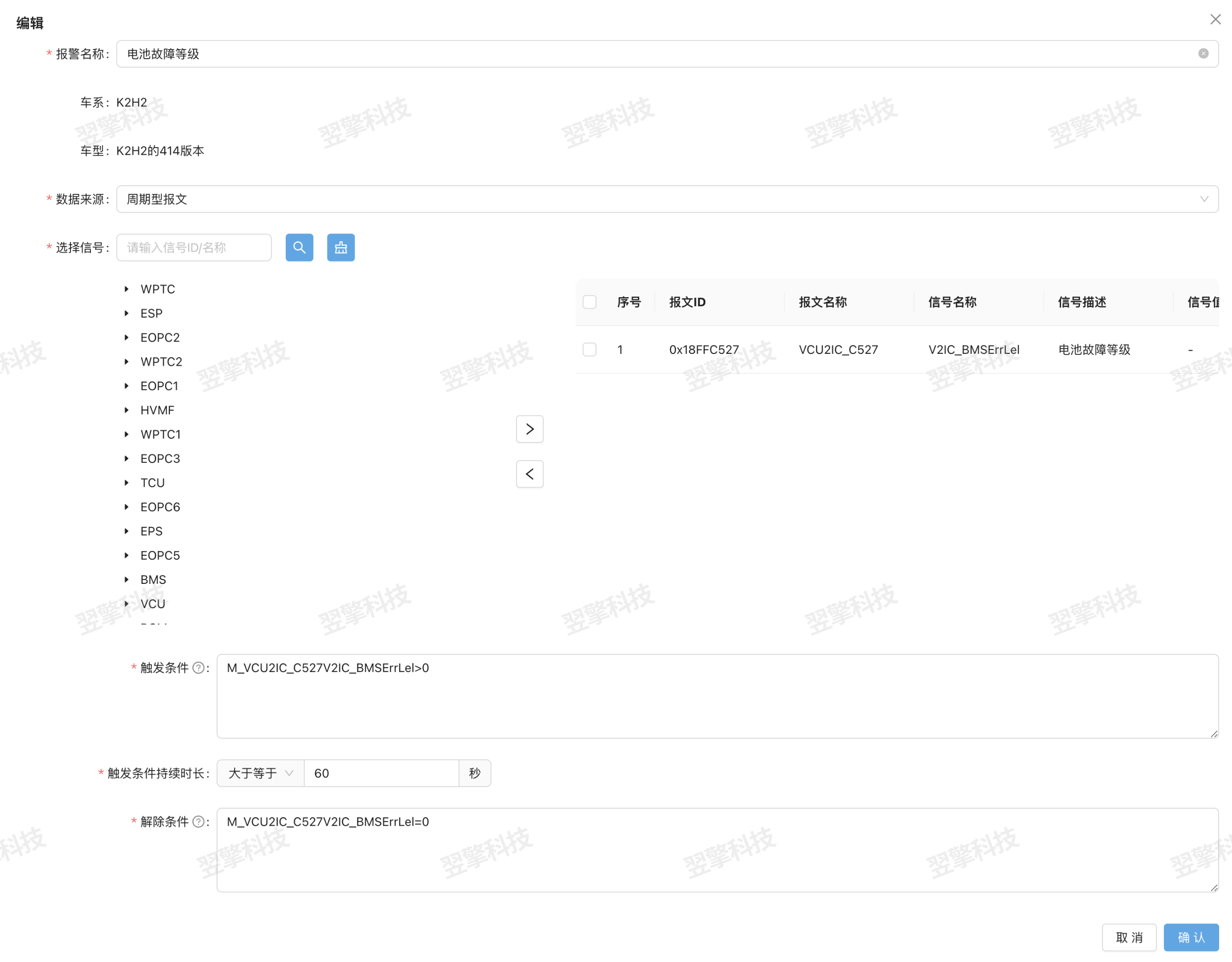 支持研发分析人员针对不同的信号设置不同的触发条件与解除条件,配置邮箱提醒,及时检测车辆异常。可基于业务诉求,选择不同的控制器、报文名称、信号名称及信号值支持正则表达式设置预警规则。