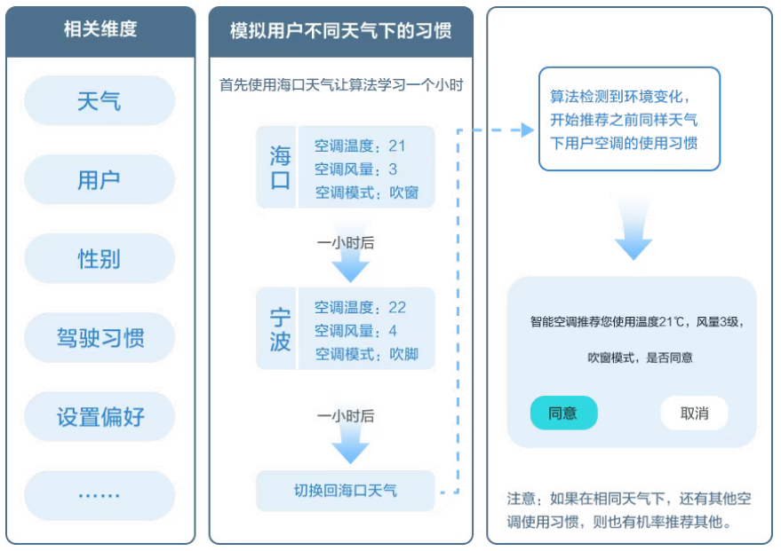 AI会根据不同天气、用户、性别、驾驶习惯、空调设置偏好,智能化适应参数变化,自动调节空调的温度、风量、模式至用户最舒适的状态,或舒适状态区间。实现满足不同环境下用户的个性化需求。